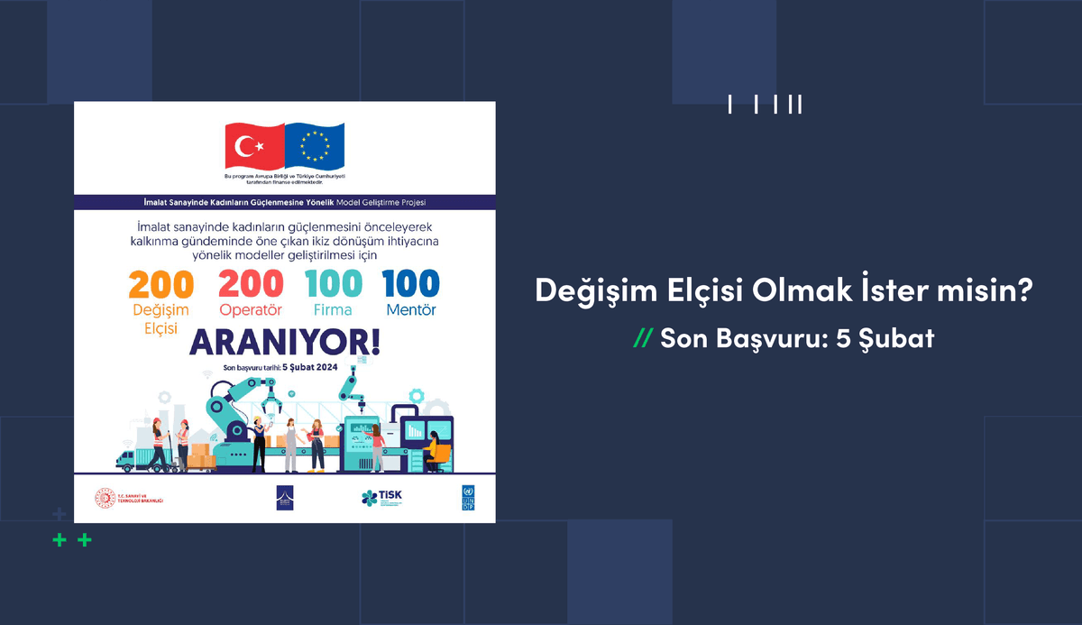 "İmalat Sanayinde Kadınların Güçlenmesine Yönelik Model Geliştirme Projesi" kapsamında, STEM alanlarından mezun kadınlar için eşsiz bir fırsat sunuluyor. Sen de projeye katılarak değişim elçisi olabilir, sektördeki kadın istihdamının güçlenmesine katkıda bulunabilirsin.